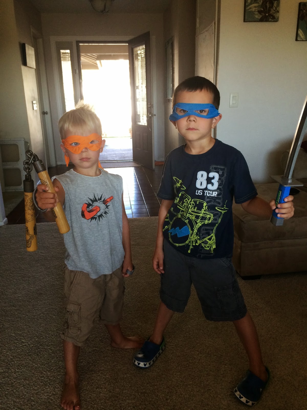 The birthday child gets to pick our activities, treats and meals for the day. Conner chose to swim (no great surprise), wanted a push pop for the afternoon and then off to lazy dog for dinner. Before going to dinner we let him open one present....dress up and weaponry for the orange ninja turtle!